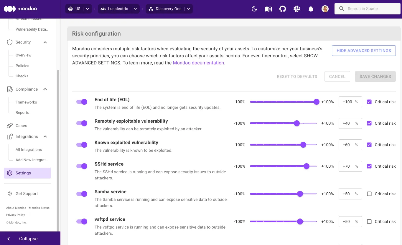 - Prioritizing the most critical risks: Mondoo goes far beyond simply using CVSS scores and considers many different factors to determine which issues pose the greatest risk to your environment. You can fully customize risk scoring and tag which assets are the most critical to your business.