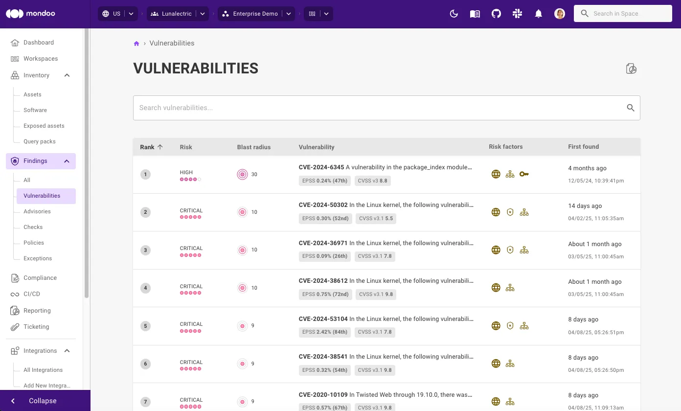 Mondoo does not only rely on NVD or MITRE data for detections. Instead, we source the vulnerabilities and advisories from vendors ourselves. This means that even if MITRE and NVD would shut down, our customers will still continue to receive security updates and vulnerabilities through Mondoo, leveraging our other sources and advisories. Additionally, we enrich these findings with exploit maturity, exploit prediction (EPSS), and known exploits to accurately prioritize important findings.