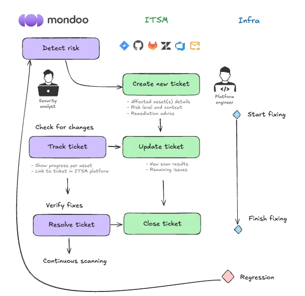 - Fitting into existing workflows: Security professionals work in security platforms, and platform engineers work in IT Service Management (ITSM) systems, such as Jira and GitHub issues. By providing all the necessary information straight in the ITSM ticket, platform engineers don’t have to switch systems, enabling them to remediate faster and avoid overlooking issues. By automatically syncing tickets in the Mondoo platform, the security team can instantly see remediation progress without needing to switch to the ITSM system.