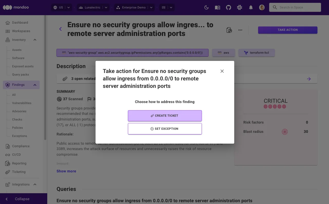 - Reducing back and forth: By including all the necessary information for platform engineers to fix the issue - including asset details, risk explanation, remediation instructions, and code snippets - Mondoo minimizes the times platform engineering needs to communicate with the security team before actually remediating.