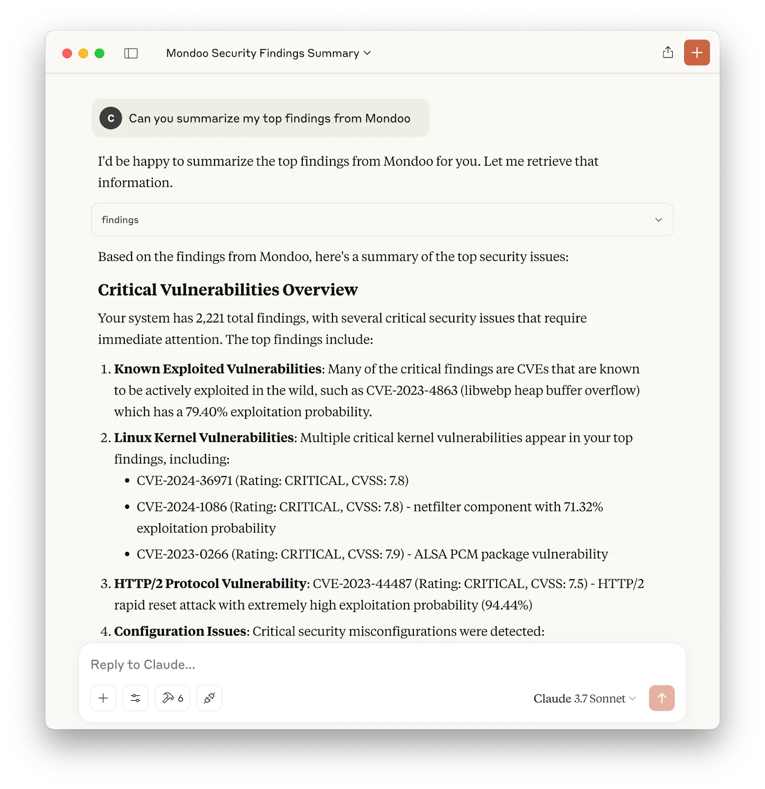 Security teams face a constant challenge of finding vulnerabilities across their infrastructure. The traditional workflow—manually identifying issues, determining their priority, creating fixes, and deploying them—is time-consuming and prone to human error. Critical vulnerabilities might go unaddressed while teams focus on less impactful issues. Instead of manually sifting through security alerts, our user leverages an AI assistant connected to Mondoo. With a simple request like "Show me my most critical security findings," the AI instantly has access to all Mondoo’s security data and presents a prioritized list.