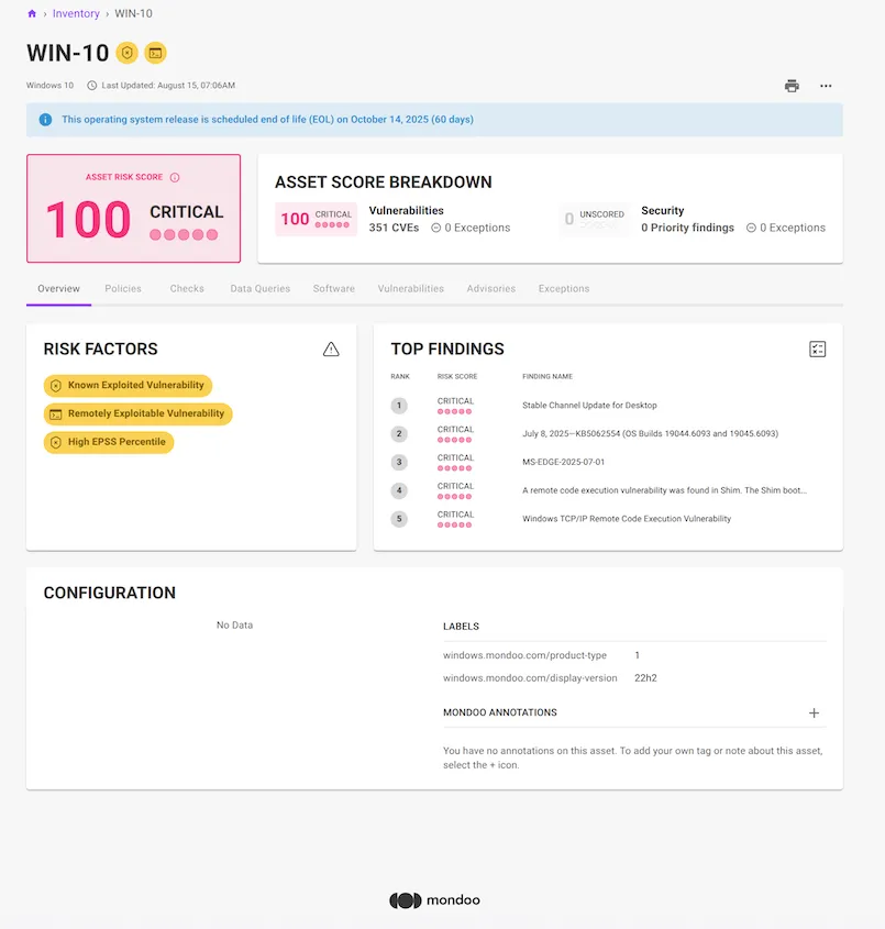 This is where Mondoo can help because we scan for all these factors, display them in the UI, and automatically adjust priority scoring according to the actual risk in your environment. This allows you to start patching the issues that are actually the most critical in your environment, so you can stay ahead of attackers and save your security team hours of manual investigation.