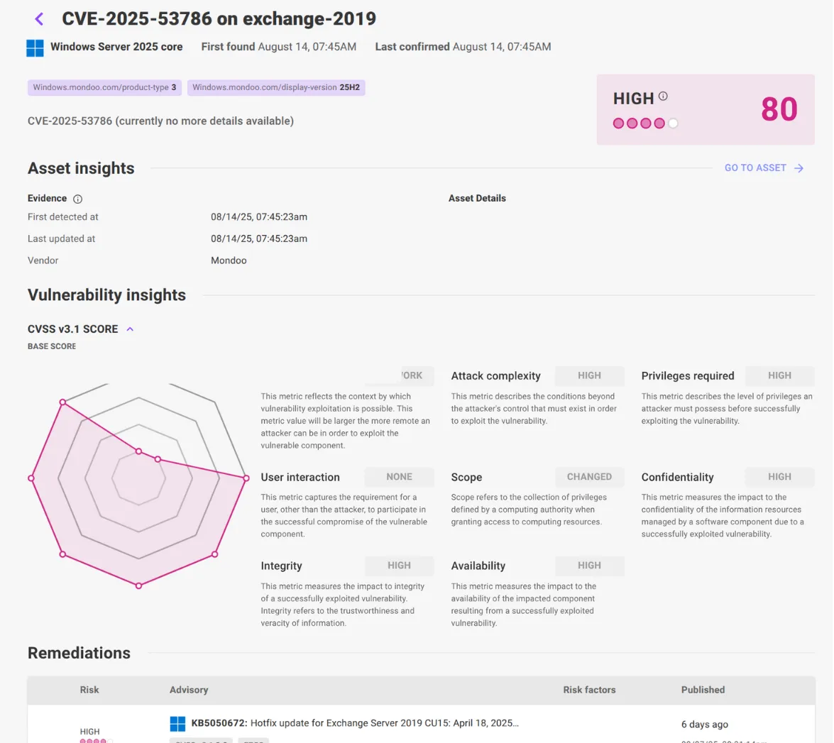 - CVE-2025-53786 (Exchange Server Hybrid Deployment) - CVSS High (8.0) - Allows an attacker to pivot from a compromised Exchange Server into an organization's cloud environment, potentially gaining control over Exchange Online and other Microsoft Office 365 services.
