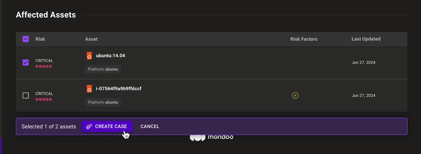 When you see a failed security check or a vendor advisory that requires fixing, you create a case for it with the click of a button. Mondoo automatically includes:
