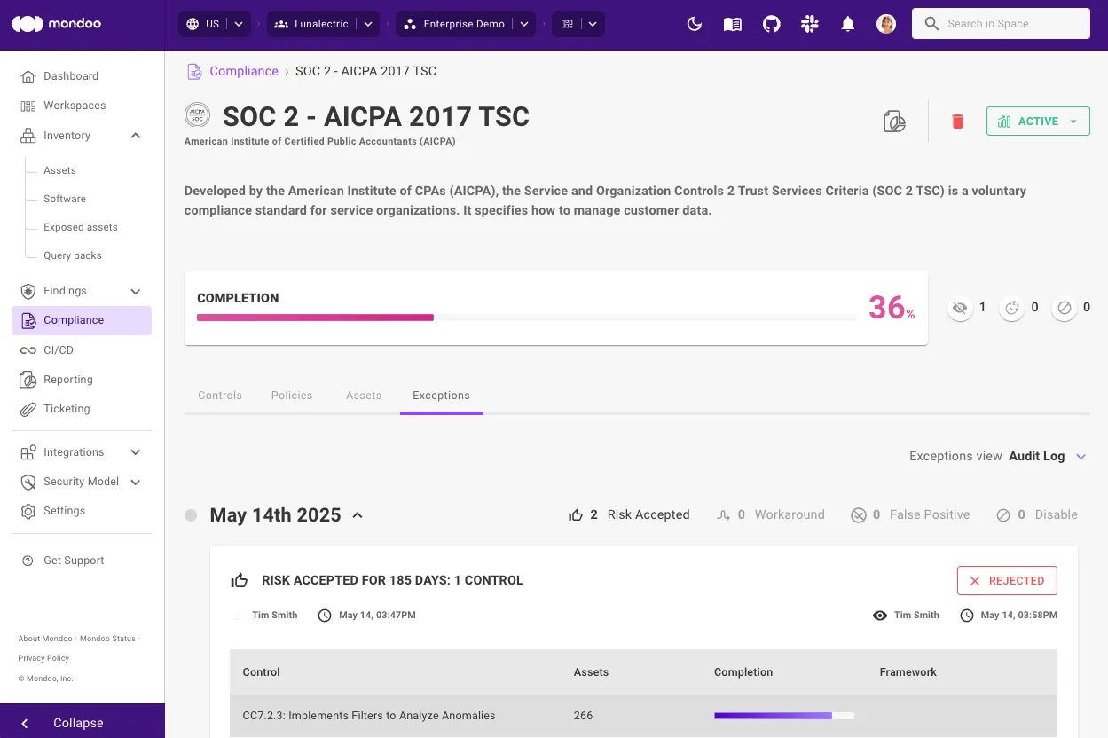 - New exception types in Compliance: Exceptions have been expanded for compliance controls, and now include Risk Accepted, Workaround, False Positive, and Disable.