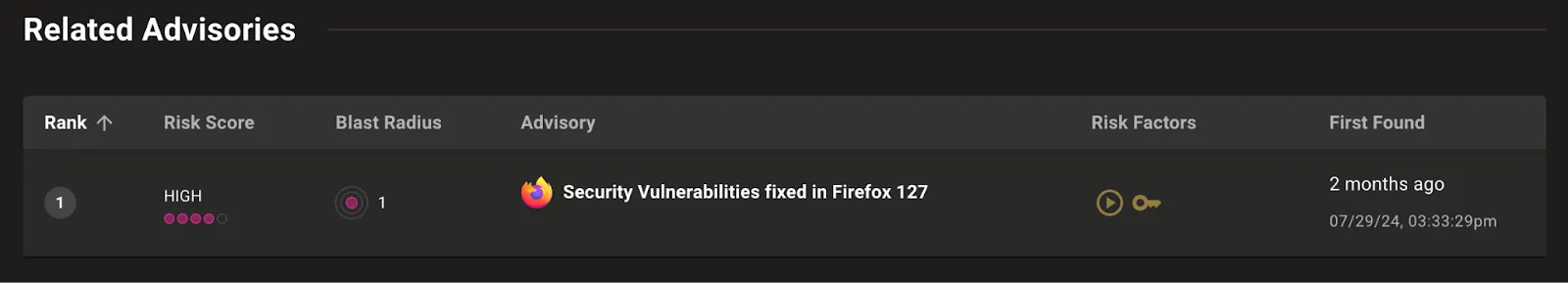 Vulnerability pages now show whether the CVE has a related advisory. Now you can dive deeper into specific vendor recommendations when evaluating the impact of CVEs on your infrastructure.