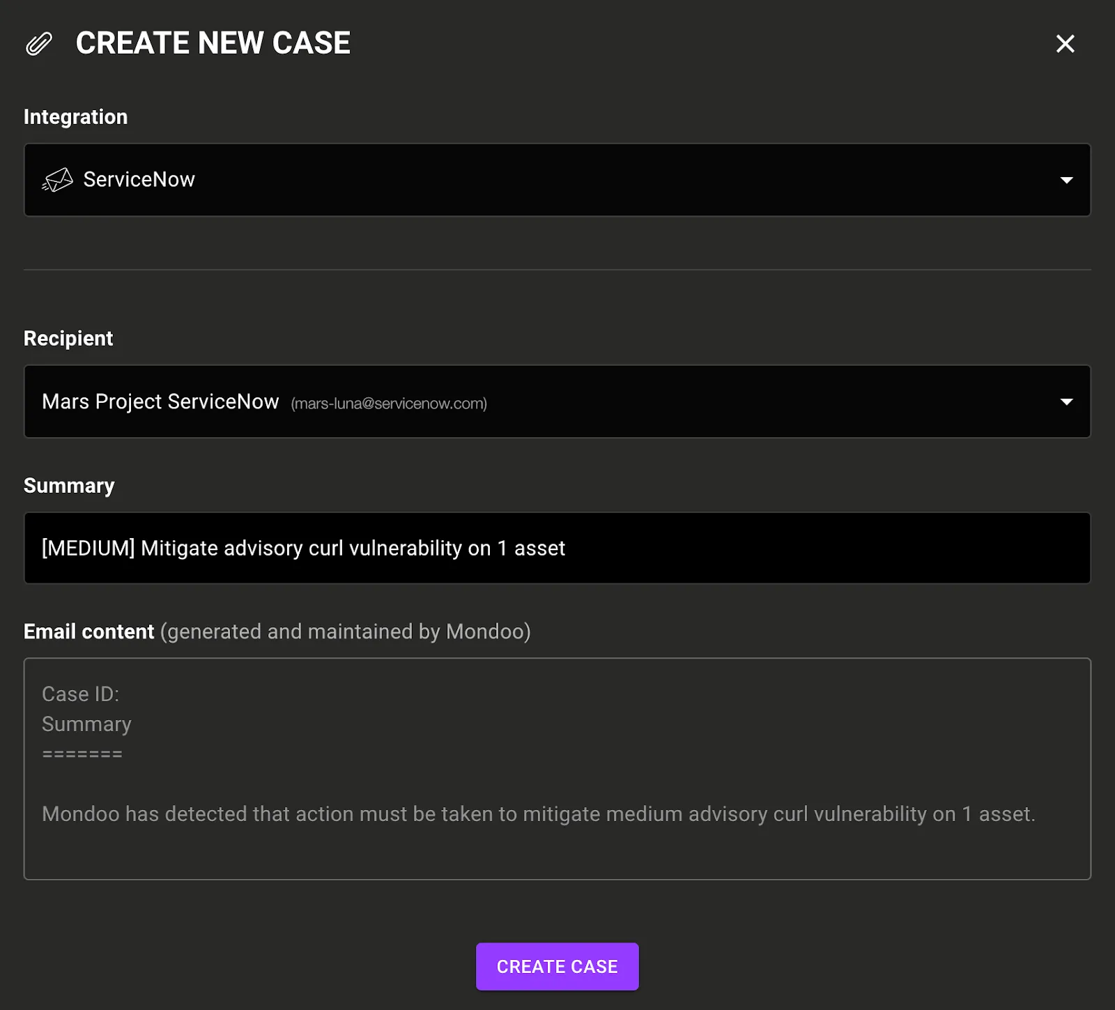 Is your project management or ticket system not in our expanded list of integrations? Don't worry—with email-based ticket integrations, we've got you covered. You can configure one or more email addresses to receive a message whenever you create a new case. Use this option to send email to your ticket system's automated listener, such as Monday's email to board, ServiceNow's inbound email, or HappyFox's email ticketing. Based on the message Mondoo sends, your ticket system adds a task to your team's project.