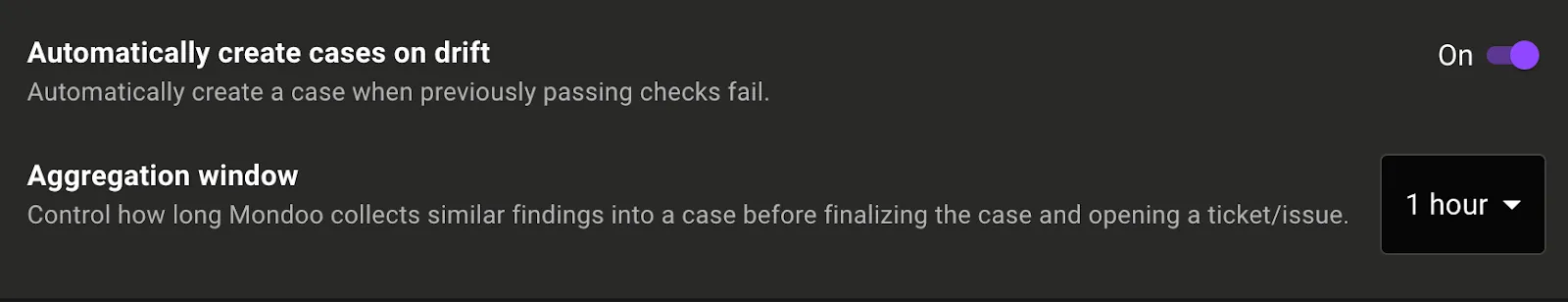 Similarly, if the same drift occurs on multiple assets, you can create a separate case for each asset or you can combine multiple assets with the same drift into a single case. When Mondoo detects drift on an asset, it can wait a configurable period of time before creating an issue or ticket in your ticket system. That waiting period gives Mondoo time to complete more scan results in your infrastructure, detect if the same drift has occurred on other assets, and add those assets to the case and the issue/ticket.