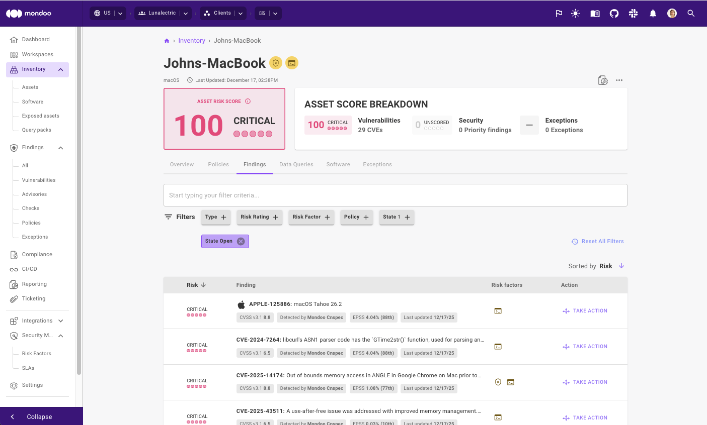 By scanning your entire IT infrastructure, including endpoints, cloud, and on-prem, Mondoo alerts if any of your Apple systems are vulnerable and need updating.