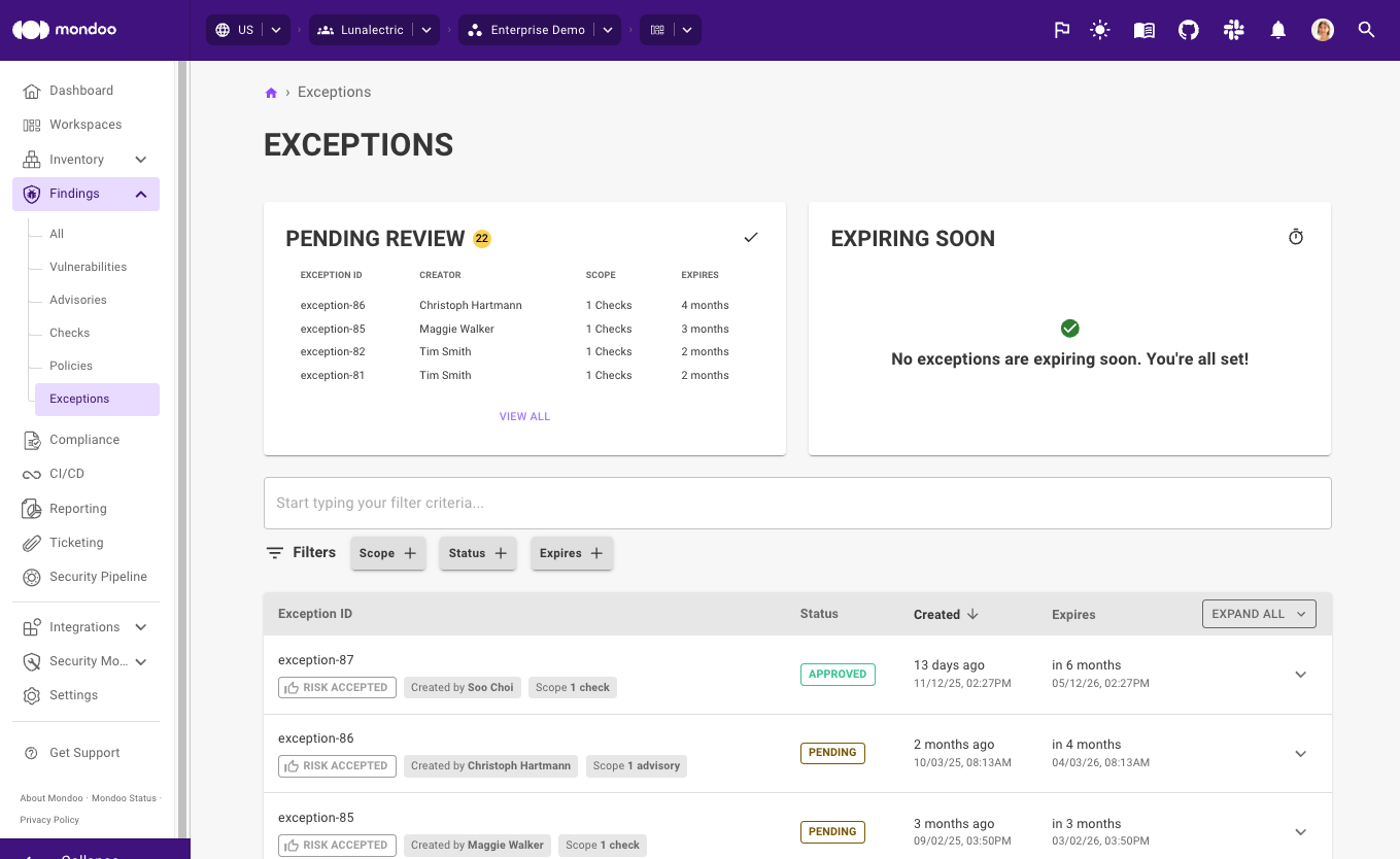 Since the Mondoo platform covers your entire IT infrastructure, from cloud, on-prem, and endpoints, to network devices, SaaS platforms and the SDLC, this means you only need to set exceptions in one place. Mondoo’s automated review process ensures that each exception gets reviewed and approved by the appropriate stakeholders, and requesters are automatically notified when their exceptions are about to expire.